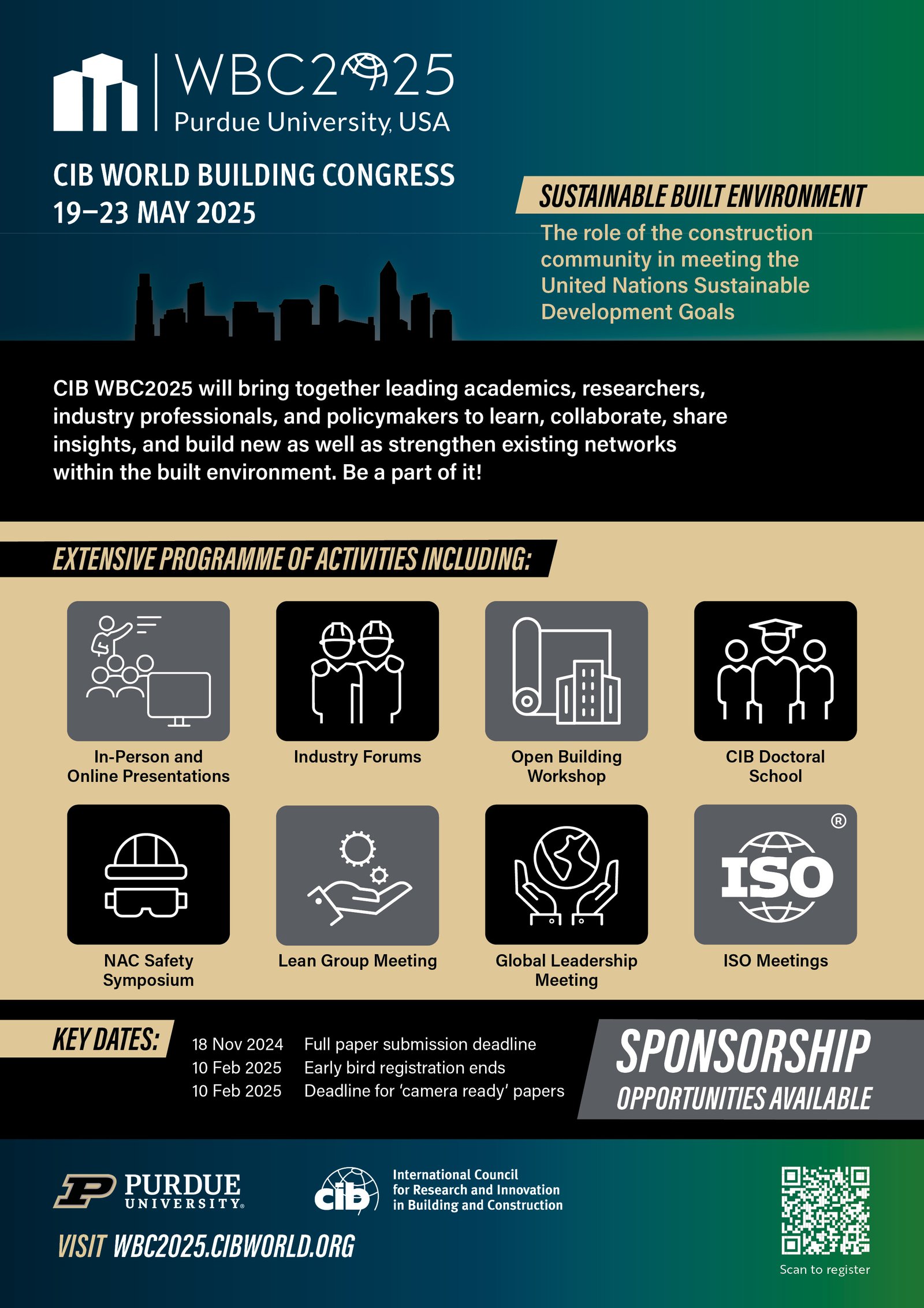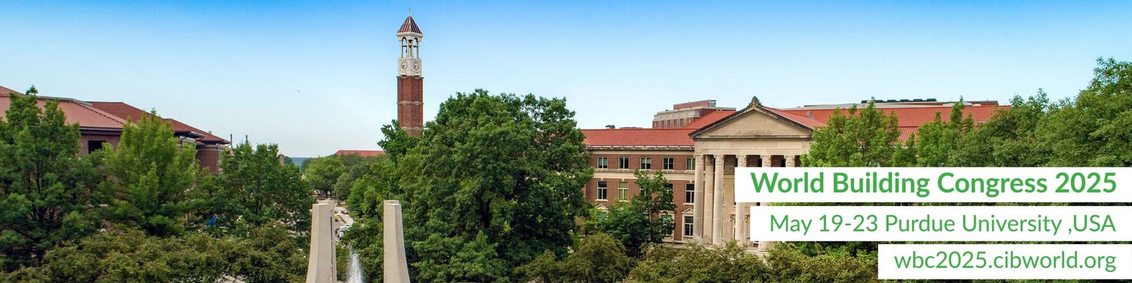 In 2025 Purdue University will host the 23rd CIB World Building Congress 2025 at its campus in West Lafayette, Indiana, USA, from 19-23 May 2025. The theme of the conference is Sustainable built environment – the role of the construction community in meeting the UN SDGs. We look forward to welcoming all CIB members, industry representatives, early career researchers and student chapters, and other delegates to THE event in the global construction calendar.